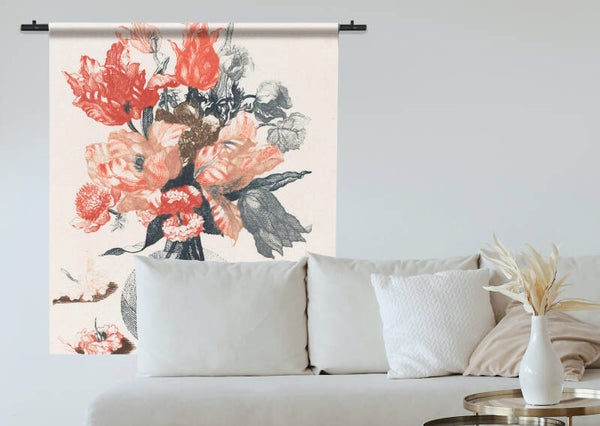 Het wandkleed is inclusief roedes, afdekknoppen en wandhaken.